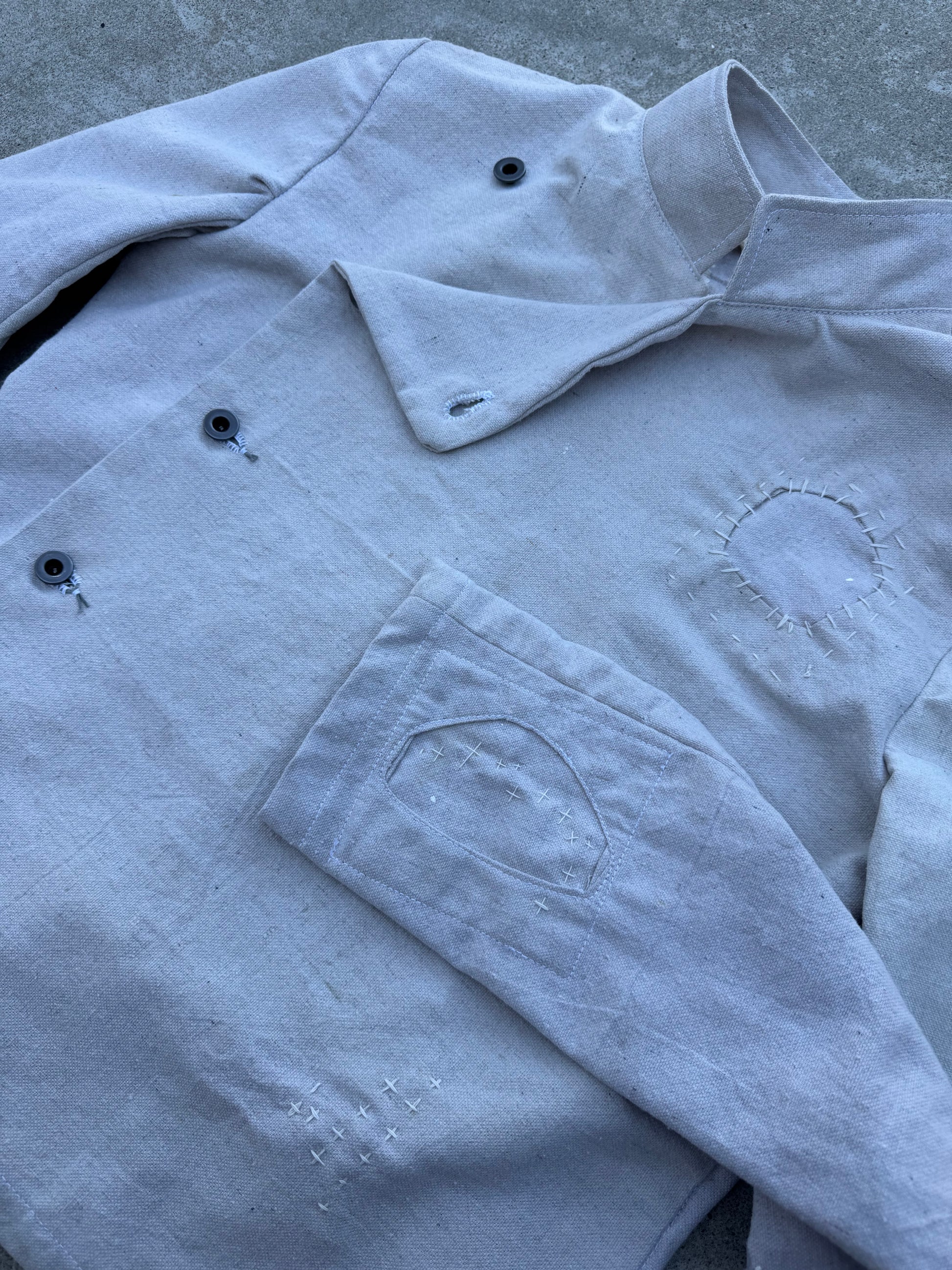 Features an asymmetrical closure held together with Japanese two prong buttons and hand sewn buttons holes
